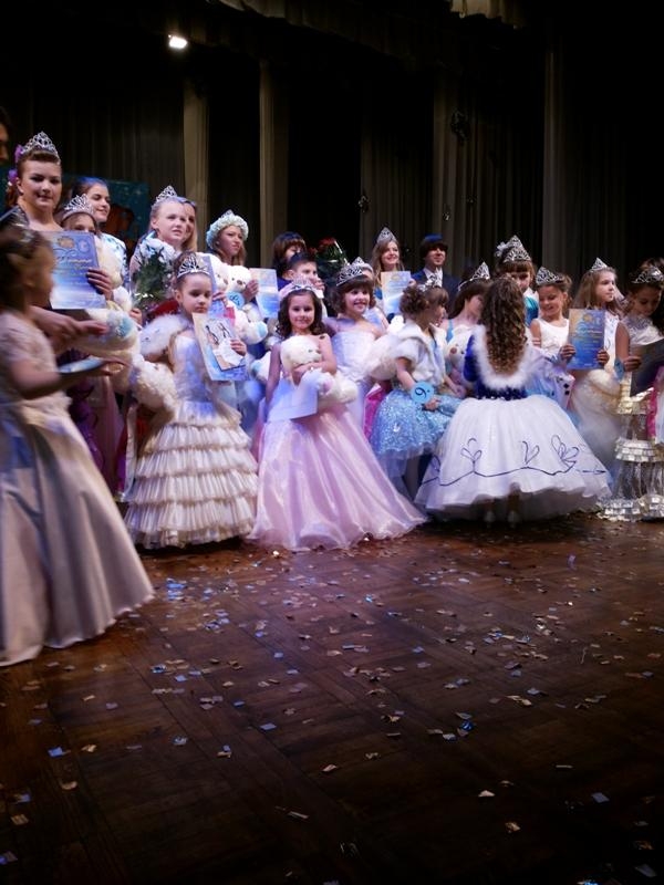 И вот гала-концерт: конкурсантки появились перед зрителями и жюри в костюмах зимней тематики и представили коротенькие "визитки", рассказав о себе и своем городе. Дарина вместе с мамой придумали белоснежное, блестящее платье Зимы с удивительным венком на голове в виде ветвей деревьев, среди которых скрывались маленькие птички. А Виктория перевоплотилась в улыбчивую, милую Снегурочку. Далее был выход в карнавальных костюмах. Дарине очень нравятся куклы, поэтому она примерила этот образ на себя, Вика со своей мамой Мариной создали костюм милашки Мини-мауса. Третье дефиле было в роскошных вечерних платьях.