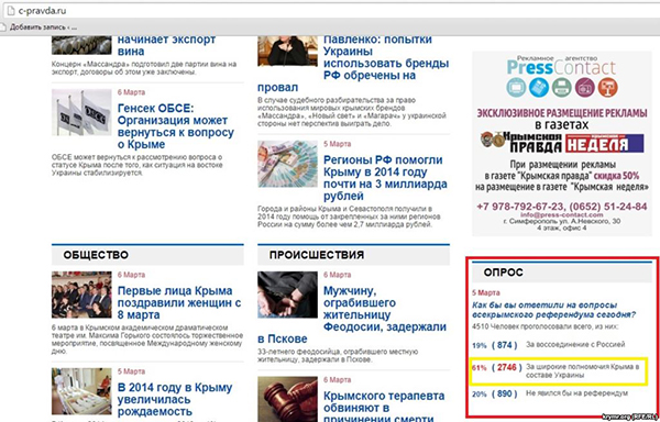 Опрос «Как бы вы ответили на вопросы всекрымского референдума сегодня?» был опубликован на сайте «Крымской правды» 5 марта 2015 года. В опросе приняли участие более 4,5 тысячи человек. Примечательно, что на данный момент сайт «Крымской правды» не работает.