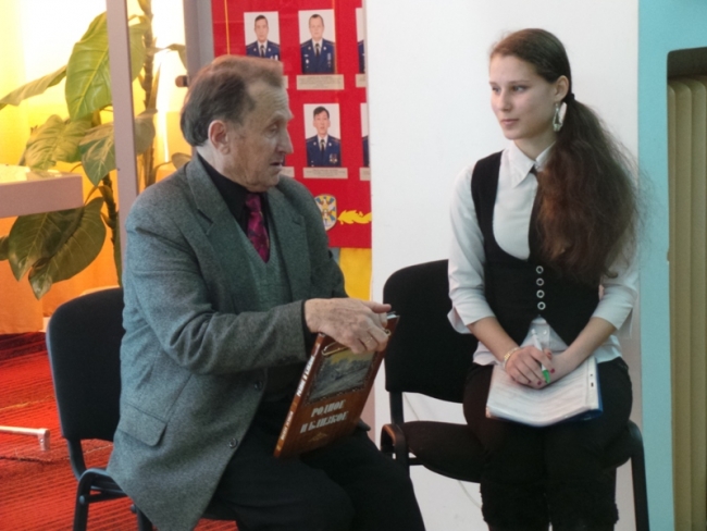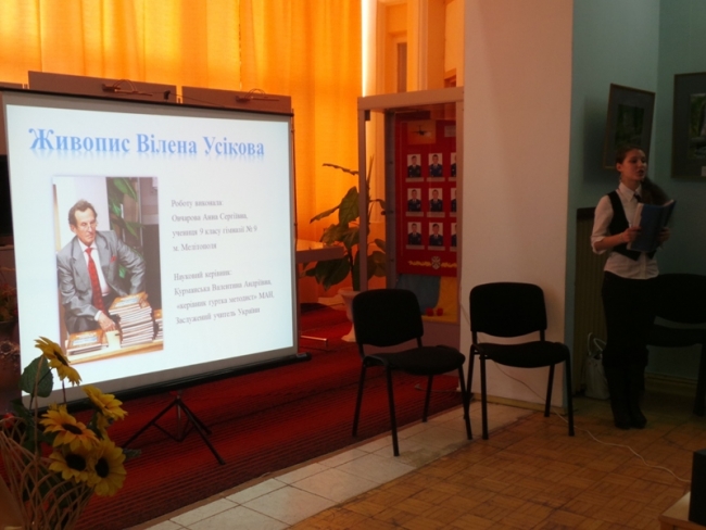 Ведущая странички "Живописна Україна" ученица 9 кл. гимназии-9 и слушательница МАН Анна Овчарова пригласила известного мелитопольского художника, писателя, мастера слова Вилена Усикова. Аня провела интервью с Виленом Николаевичем, из которого собравшиеся узнали о его первых шагах в живописи, о художниках, повлиявших на его творчество, о любимых темах картин. А. Овчарова поделилась своими исследованиями по теме "Грани творчества Вилена Усикова". Эту научную работу она защищала на областном этапе всеукраинского конкурса-защиты научно-исследовательских работ и вернулась из области призером. Восхищенный "объект" ее исследований В. Усиков подарил девушке свою книгу "Родное и близкое" с дарственной надписью.