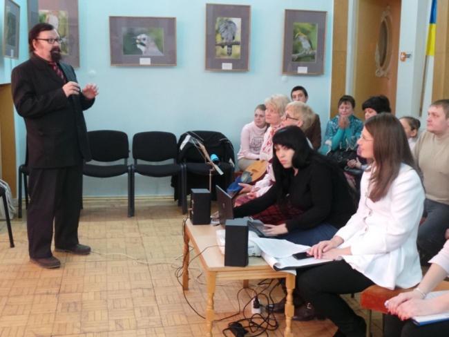 Мероприятие открылось презентацией "Мистецтво Мелітополя": под звуки украинской музыки на экране чередовались картины украинских художников, которые хранятся в фондах нашего музея. А слушательница МАН Даша Попова очень эмоционально, с душой рассказала монолог об Украине. Далее методист МАН, Заслуженный учитель Украины Валентина Курманская рассказала всем присутствующим о "страничках" мероприятия. Их было четыре: "Живописна Україна", "Театральне мистецтво Мелітополя", "Пісенне мистецтво Мелітополя", "Мистецтво слова". И живой, яркой "иллюстрацией" на каждой страничке был ее гость.