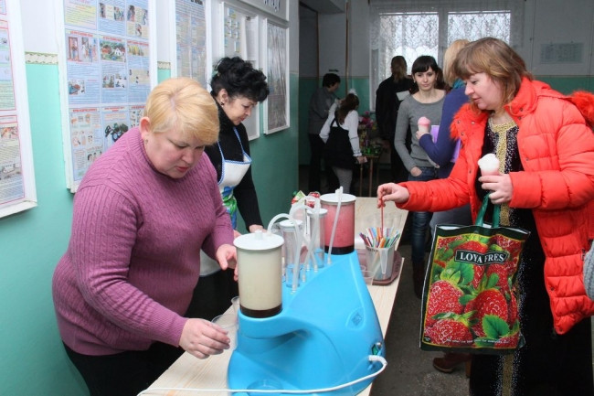 После уроков родителям предложили поучаствовать в школьной благотворительной ярмарке, и помочь тем самым нашим ребятам на передовой и семьям переселенцев, которые проживают в Мелитополе, учатся в школе. Кроме того все родители могли угоститься свежеприготовленными кислородными коктейлями. Детвора в школе систематически пьет их целыми курсами, оздоравливаясь и укрепляя иммунитет. Один пенный, яркий, сладкий коктейль из натуральных соков и сиропа из корня солодки, обогащенный кислородом, заменяет трехчасовую прогулку по сосновому лесу!