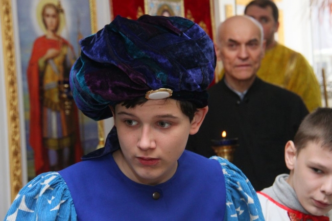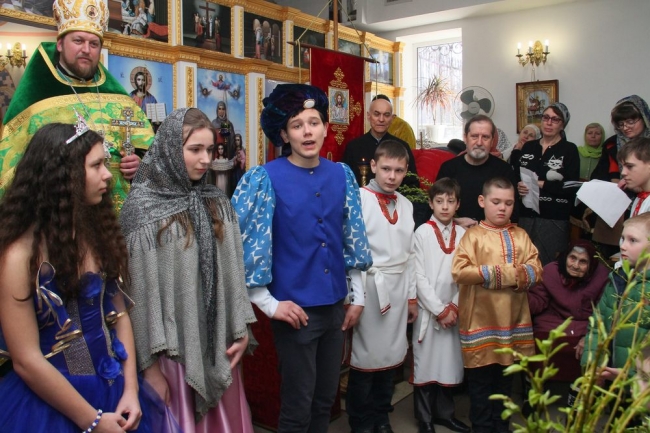 В Свято-Георгиевском храме воспитанники воскресной школы «Георгиевцы» показали театрализованное представление. По словам завуча школы «Георгиевцы» Ирины Лебедь, на каждый праздник дети и педагоги стараются подготовить свое видение этого праздника. К празднику Пасхи уже поставлена пьеса, состоящая из сценок от Прощеного воскресенья до Дня жен-мироносиц. На Прощеное воскресенье «георгиевцы» показали часть постановки слушателям «Университета третьего поколения» при терцентре. Сегодня выступали перед прихожанами храма о смысле Вербного воскресенья, Благовещения. В постановке участвовали ребята от самых старших 15-летних воспитанников, таких как Кристина Арабаджи до самых маленьких, таких как четырехлетняя Катюша Буряк. Очень старались юные артисты Кирилл Щербаков, Андрей Емцев, Анастасия Лещенко, Марина Жидович, Анна Попович, Платон Емельянов, Виктория Пшеничникова. Их выступление прихожане оценили горячими аплодисментами.