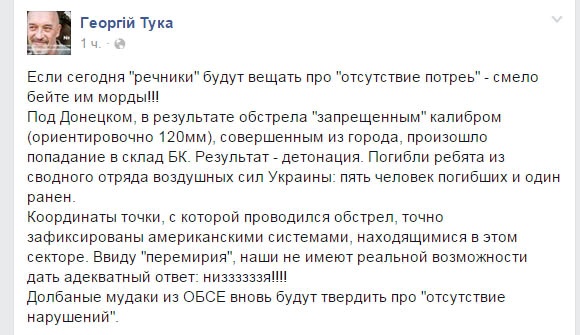 Под Донецком в результате обстрела "запрещенным" калибром (ориентировочно 120 мм), погибли 5 украинских бойцов. Об этом на своей страничке в "Фейсбуке" написал волонтер группы "Народный Тыл" Георгий Тука.