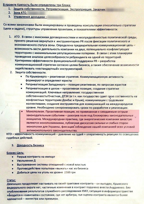 По данным нардепа, документ был разработан руководством гендиректора ДТЭК Максима Тимченко и получил название «Крепость».