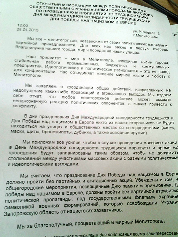 На сегодня было запланировано подписание Меморандума между общественными организациями Мелитополя о сохранении мира и стабильности в городе на майские праздники.