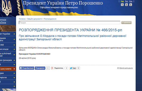 В документе за номером № 466/2015-рп сказано: "Звільнити МОРДИКА Олександра Миколайовича з посади голови Мелітопольської районної державної адміністрації Запорізької області.