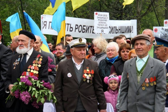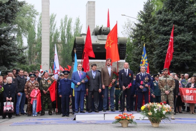 На почетных местах – ветераны войны, на груди которых ордена и медали. К сожалению, их строй существенно поредел. Рядом с ветеранами Великой Отечественной войны – более молодые ветераны: ветераны войны в Афганистане, а также военные в камуфляже с желто-голубыми нашивками на рукавах. Со словами поздравления с победным юбилеем к мелитопольцам обратился секретарь горсовета Сергей Минько. Когда он сказал, что поздравляет с 70-летием Победы над нацизмом во Второй мировой войне, послышались отдельные возгласы: «В Великой Отечественной!», «Ганьба!» Криками «Ганьба!» были встречены и его слова о том, что «…сегодня мы чествуем всех защитников: и тех, которые воевали в 40-хх, и тех, которые защищают суверенитет и независимость нашей страны сейчас». Чувствовалось, что в толпе некоторые старались «завести» людей, накалить ситуацию, сорвать и омрачить ветеранам празднование Дня Победы.