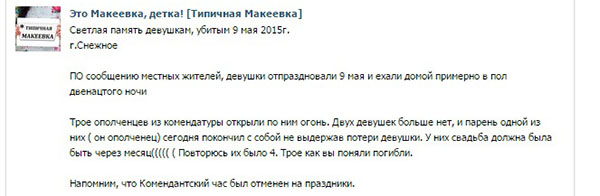 - Они отпраздновали 9 мая и ехали домой примерно в половину двенадцатого ночи. Мудаки из комендатуры (их было трое) открыли по ним огонь. Просто так. Может, машину хотели отжать. Ну, это не важно. В общем, постреляли. Двух девушек больше нет и парень одной из них (он ополченец) сегодня покончил с собой, не выдержав потери девушки, – написал администратор в паблике "Снежнянские новости" в социальной сети "ВКонтакте".