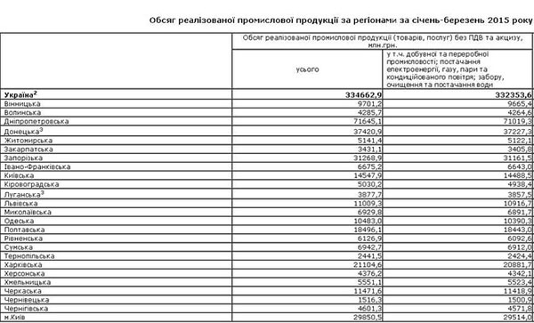 По данным Государственной службы статистики Украины, с января по март 2015 года Запорожская область реализовала промышленную продукцию на 31 миллиард гривен. С таким результатом регион занял третью позицию среди всех областей Украины.