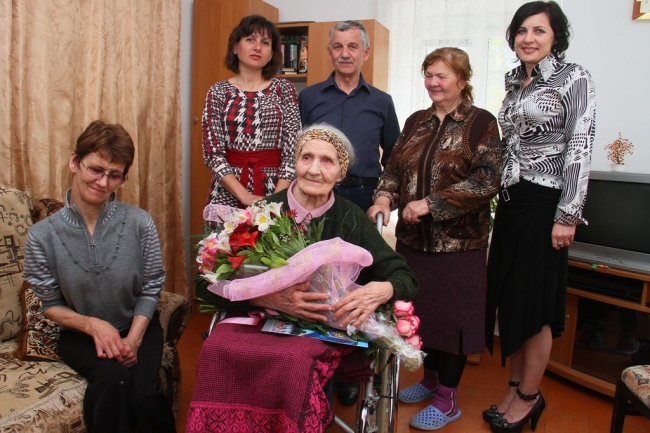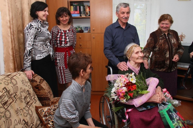 Поздравить мелитопольскую долгожительницу пришли секретарь горсовета Сергей Минько, управделами исполкома Елена Дубинина, депутат горсовета Тарас Генов, представители уличного комитета, соседи. Цветы и подарки, слова поздравлений и благодарности - все для именинницы, которая в этот день была в центре внимания.