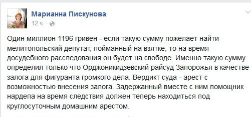 Задержанный вместе с ним Николай Коржилов будет находиться под домашним арестом, сообщила пресс-секретарь Запорожской областной прокуратура Марианна Пискунова.
