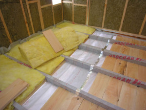 После этого начинается процесс установки лаг, между которыми засыпается утеплитель. Им может служить керамзит, шлак, опилки или гранулированный пеностирол. Самым лучшим материалом считают пенополистирол в виде плит. Он обладает легким весом, низкой теплопроводностью и нужной жесткостью. Все остальные утеплители также обладают хорошими теплоизолирующими свойствами. И какой выбирать, решает хозяин. После того, как утеплитель засыпан, сверху кладут половые доски.