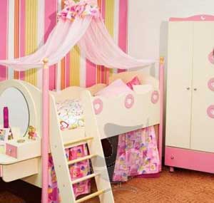 После обоев нужно подобрать правильную детскую мебель. Самое главное из нее – это кровать. Если в семье растет две девочки, можно приобрести двухъярусную кровать. Именно такие кровати и стоят в большинстве детских комнат.