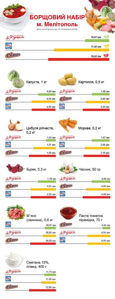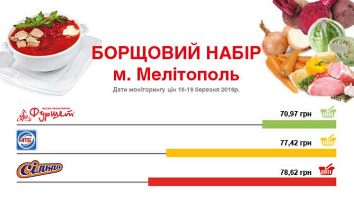 Метою дослідження було дізнатися, скільки коштує зварити борщ з продуктів, придбаних в супермаркетах міста. Для аналізу взяли найбільші мережі і маркети: