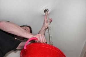 Придя домой и увидев, что на потолке образовался большой пузырь, внутри которого находится вода, не стоит впадать в панику. Прежде всего, нужно отключить на щитке все электричество в доме. Затем найти все ведра и тазики и принести их в комнату. Аккуратно снять люстру и открутить патрон. После этого, руками перекатить воду к образовавшемуся отверстию и осторожно слить всю воду.